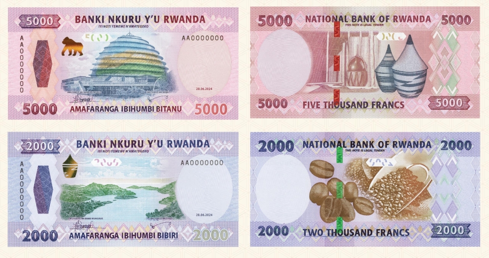 The National Bank of Rwanda (BNR) has issued new banknotes of Rwf5,000 and Rwf2,000 that will be in circulation along with the existing banknotes. According to the official gazette dated August 30, the issuance of new notes ordered by President Paul Kagame was done following the proposal by the Minister of Finance and Economic Planning which was considered and approved by the Cabinet during its meeting of August 23. ALSO READ: BNR gears up for new Rwf2,000, Rwf5,000 notes “A new banknote of Rwf5,000 and of Rwf2,000 are in circulation simultaneously with the existing banknotes of Rwf500, Rwf1,000, Rwf2,000, and of Rwf5,000 which have legal tender in Rwanda,” reads part of the gazette. There are a number of reasons for changing banknotes, including the need to upgrade security features to avoid counterfeiting. It is still unclear how much the adoption of the legal tender cost the Government. Rwanda’s banknotes are printed in Kinyarwanda and English. ALSO READ: Rwanda’s leap into central bank digital currency Characteristics of the new notes The new banknote of Rwf5,000 sized 145 x 72mm has lilac as the dominant colour with its watermark being the Coat of arms of the Republic of Rwanda located at the righthand of the note and an electrotype representing the letters “BNR’’ below. On the front, it has the principal design of the building of Kigali Convention Centre, at its left-hand side will be an image of a gorilla changing colour and the signature of both the Governor and Deputy Governor of the central bank below the image. The face value of the banknote is written horizontally in each corner except the one of upper right-hand side, and the date of issuance “28.06.2024”, written on banknote at the bottom of the watermark. At the back of the note there are two small baskets with one carrying a calabash placed inside the Rwandan traditional house, and the face value of the note written horizontally in all corners, among other characteristics. The Rwf2,000 banknote sized 142 x 72mm, has clear violet as its dominant color and the same watermark of Coat of arms of the Republic of Rwanda and an electrotype representing the letters “BNR’’ below Its principal design on the front is Lake Kivu mountains and the face value of the banknote is written horizontally in each corner except the one of upper right. On the back, its principal design is roosted coffee beans, among other characteristics. Both notes have a wide windowed security thread in which the micro text reads “BNR” and their face value which changes colour from green to blue depending on direction that the banknote is taken, located on the left-hand side of the banknote.