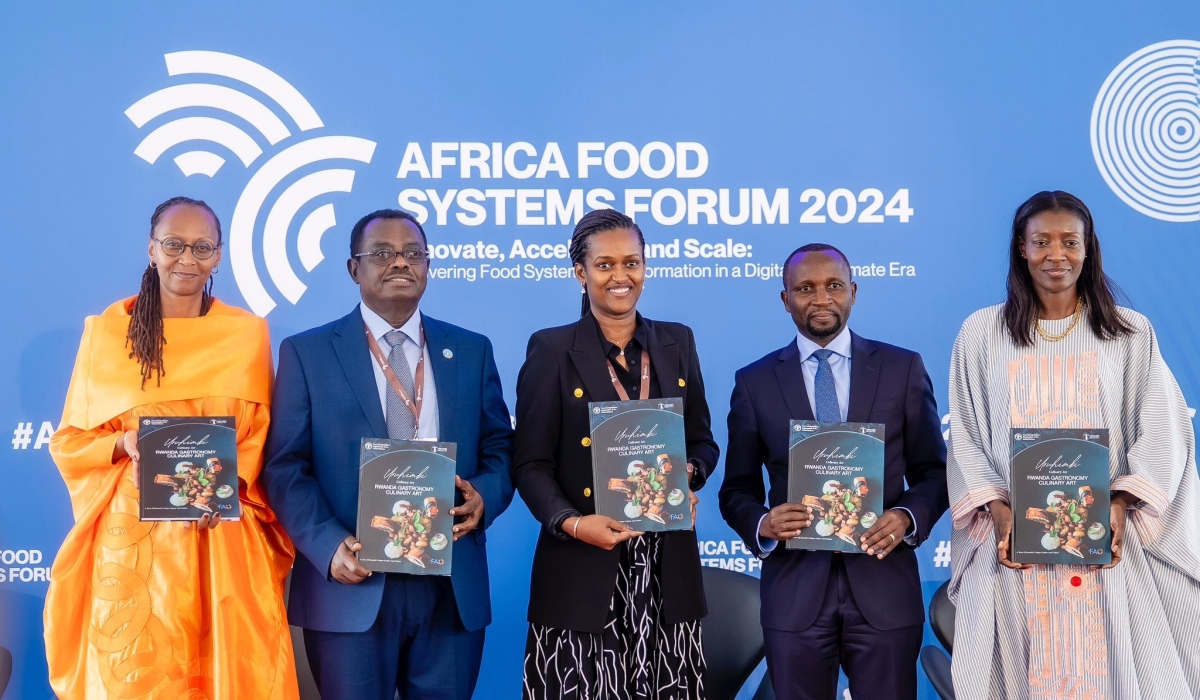 R-L: FAO Representative in Rwanda, Coumba Sow; the Minister of Agriculture and Animal Resources, Ildephonse Musafiri; the Minister of State for Youth and Arts, Sandrine Umutoni; FAO Assistant Director-General and Regional Representative for Africa Abebe Haile-Gabriel; and Sophie Kabano, Curator and Cultural Promoter at Rwanda Arts Initiative, launch Uruhimbi: Rwanda Gastronomy and Culinary Art, in Kigali, on September 4, 2024 (Photo by Jean Pierre Mazimpaka at MINAGRI).