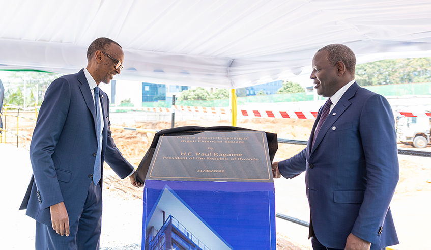 President Kagame and James Mwangi, Managing Director and chief executive of Equity Holding Group Plc, inaugurate the construction works for the proposed Kigali Financial Square towers in the heart of the Central Business District, on Tuesday, June 21. Village Urugwiro