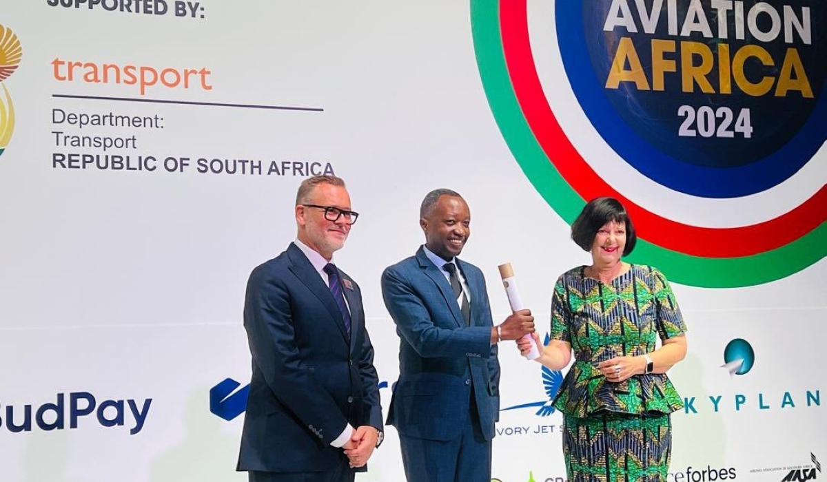 State Minister in the Ministry of Infrastructure Olivier Kabera (c) and other officials during the 2024 Aviation Africa Summit in Gauteng, South Africa on Monday, September 16. Rwanda was announced as the host of the Aviation Africa Summit and Exhibition 2025. Courtesy