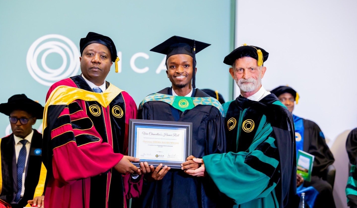 Christian Shema Bagiruwigize (C) receives Vice Chancellor's Honor Roll recognition presented to her by RICA Vice Chancellor Ron Rosati, and Prime Minister Edouard Ngirente, on September 20, 2024. Photos by Craish Bahizi