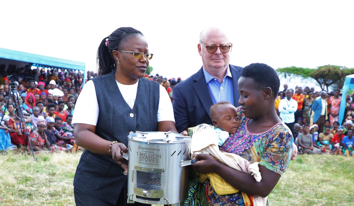 Minister of Environment Jeanne d'Arc Mujawamariya and Neil McDougall, Chairman of DelAgua Group hand over a stove to a resident in Rwamagana District on October 26. All Photos by Craish Bahizi