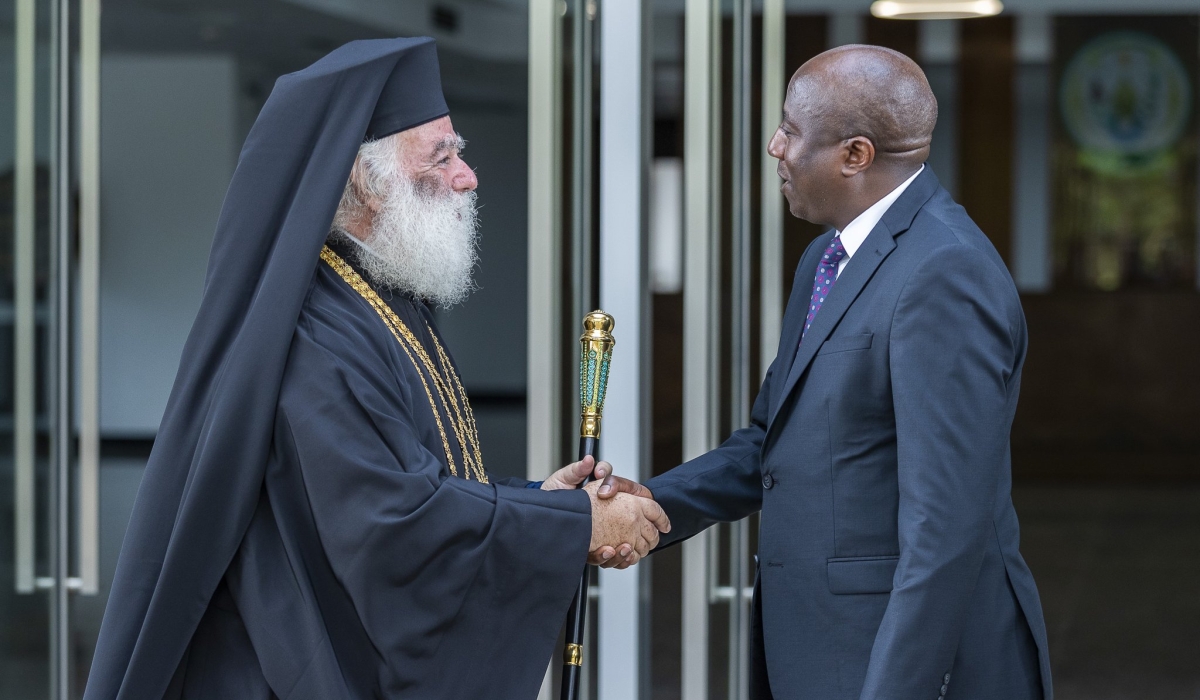 Prime Minister Edouard Ngirente (R) shakes hands with His Beatitude Theodoros II, the Orthodox Pope and Patriarch of Alexandria and All Africa, in Kigali, October 29, 2022 (Photo credit,Office of Prime Minister)