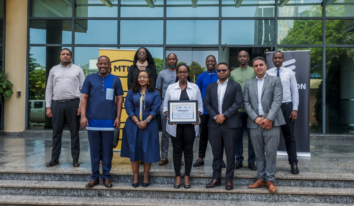 MTN Rwanda and Ericsson staff present a certificate of appreciation to the Mayor of the City of Kigali, Samuel Dusengiyumva, marking the completion of the Kigali network modernization project. (Courtesy)