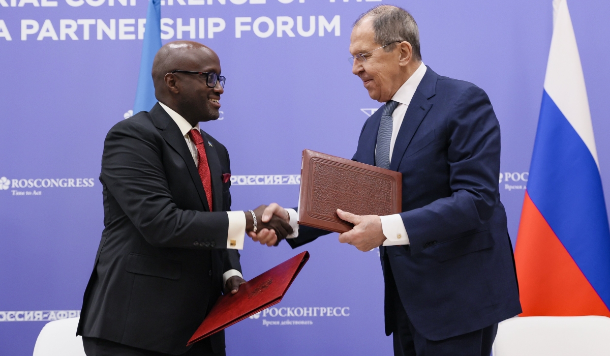Rwanda's Minister of Foreign Affairs and International Cooperation, Olivier Nduhungirehe, and his Russian counterpart Sergey Lavrov, shake hands after signing the visa waiver agreement for holders of service and