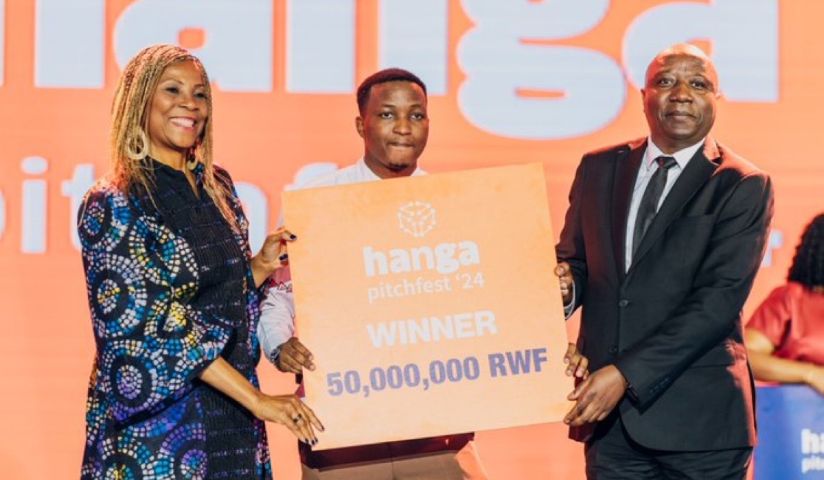 Cedric Mupenzi, founder of Sinc Today, received the grand prize in Hanga PitchFest 2024 from Prime Minister Edouard Ngirente and Ahunna Eziakonwa, the Director of the United Nation Development Programme’s (UNDP) Regional Bureau for Africa.