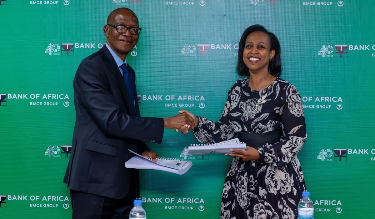 Emmanuel Ntaganda, the Chairperson of the Board of Directors at Bank of Africa, hands over the position to the newly appointed Chairperson, Betty Sayinzoga. in Kigali on November 15 Photo. Courtesy