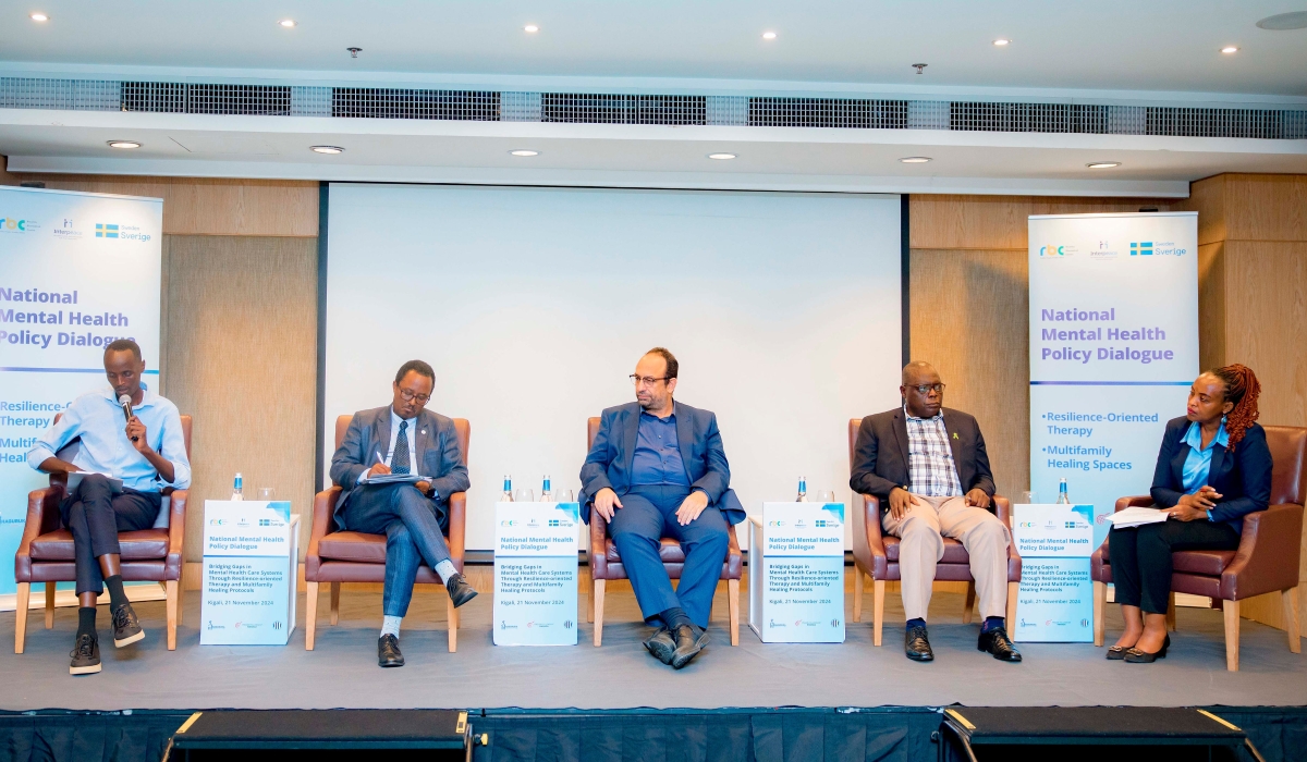 A panel discussion at the National Dialogue on November 21. The meeting brought together experts, policymakers, and practitioners in mental health to explore strategies for advancing mental health care in Rwanda.