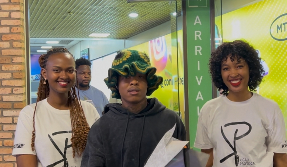 South African rapper Nasty C takes a photo with two young women from Kigali Protocol upon arrival at Kigali International Airport on Thursday night ahead of his performance at Davis D's Shineboy Fest-courtesy