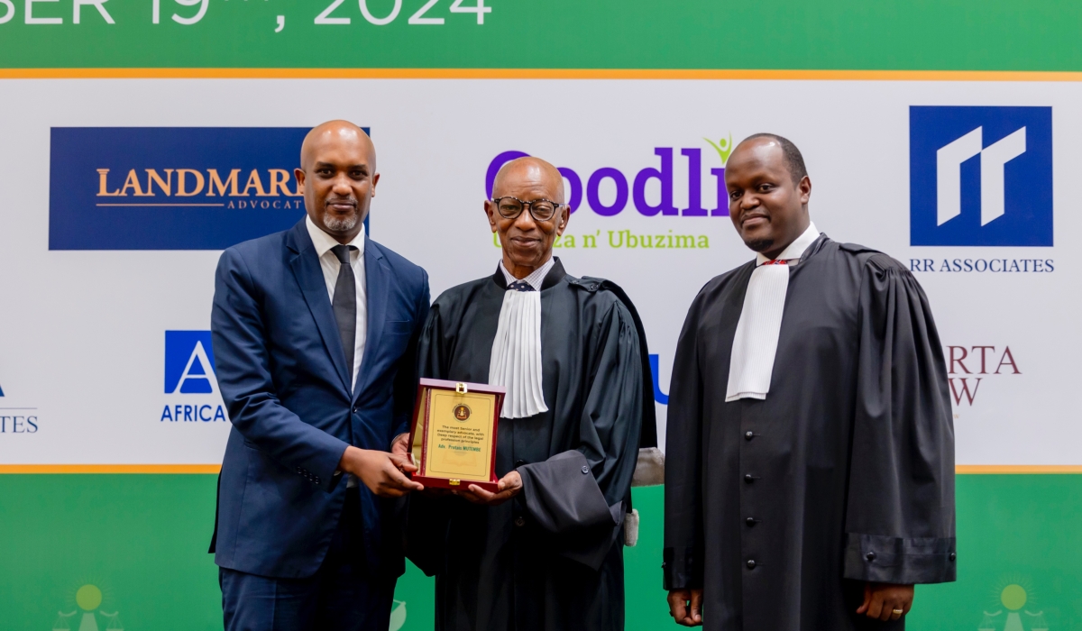 Justice Minister Emmanuel Ugirashebuja (left), and the President of Rwanda Bar Association, Moise Nkundabarashi (right) recognise Adv. Protais Mutembe (centre), for his outstanding contributions to the legal profession. COURTESY