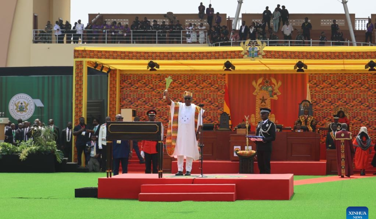 Ghanaian President John Dramani Mahama took the oath of office on Tuesday after winning the presidential election in December last year. A large crowd of Ghanaians from all walks of life, along with party supporters, gathered at the Black Star Square in Accra, the country's capital, to witness the grand ceremony. The event was also attended by African heads of state and other foreign dignitaries. Mahama said that the inauguration marks a new chapter in Ghana's history and presents a rare opportunity to reset the country in various ways. We have been through severe economic hardships as we moved from one crisis to another in recent years. But there is hope on the horizon, and today marks the beginning of a new opportunity, an opportunity to redefine our governance and economic strategies. Together, we can reset our beloved nation, Mahama said. He pledged that his government would address youth unemployment by fostering strong partnerships with the private sector to create decent and well-paying jobs. In this resounding victory, I see a clarion call, particularly from the youth of Ghana, and this moment is a powerful affirmation that your voices matter and that your future must be our priority, he stated. Born in 1958 in Ghana's Savannah region, Mahama previously served as Ghana's president from 2012 to 2017. John Dramani Mahama (C) is sworn in as the Ghanaian president at the Black Star Square in Accra, Ghana, Jan. 7, 2025. Mahama took the oath of office on Tuesday after winning the presidential election in December last year. (Xinhua/Seth)