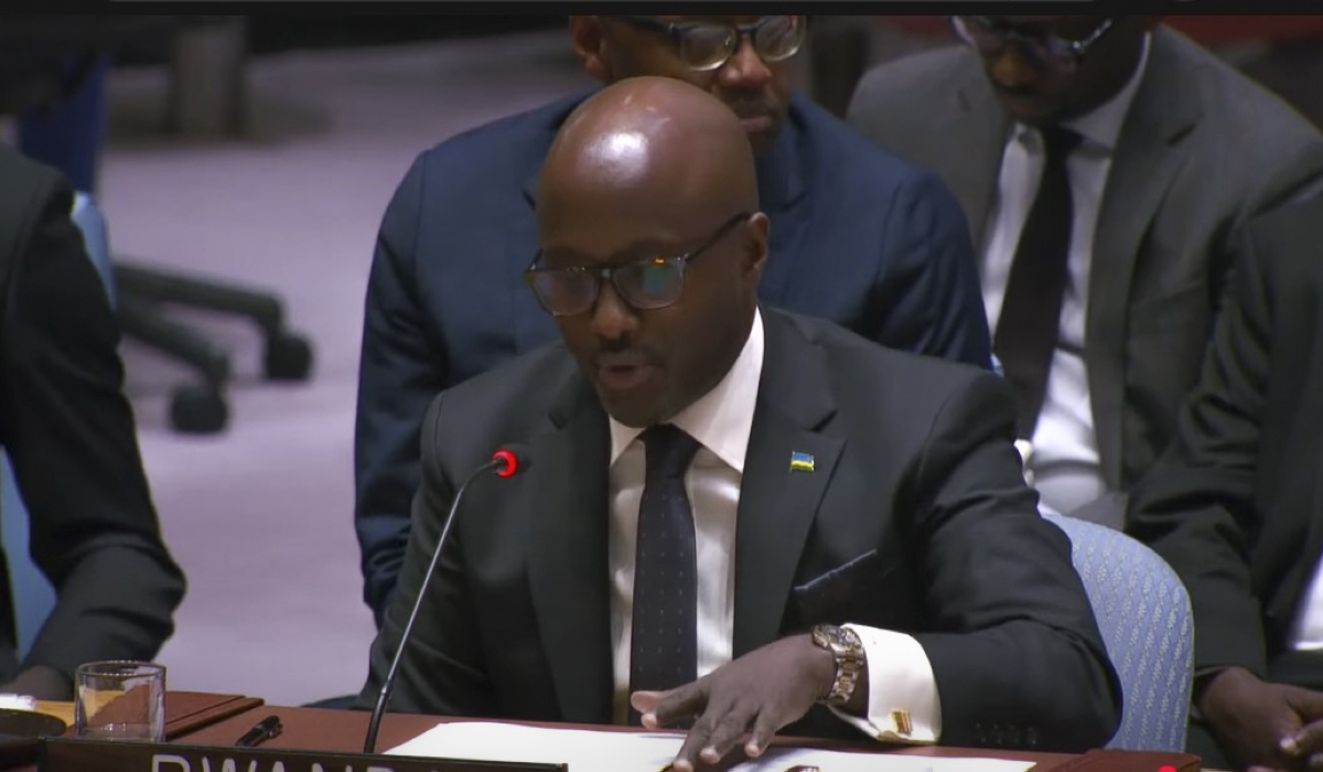 Minister of Foreign Affairs and International Cooperation Olivier Nduhungirehe addresses UN Security Council on terrorism in Africa, in New York on Tuesday, January 21. Courtesy