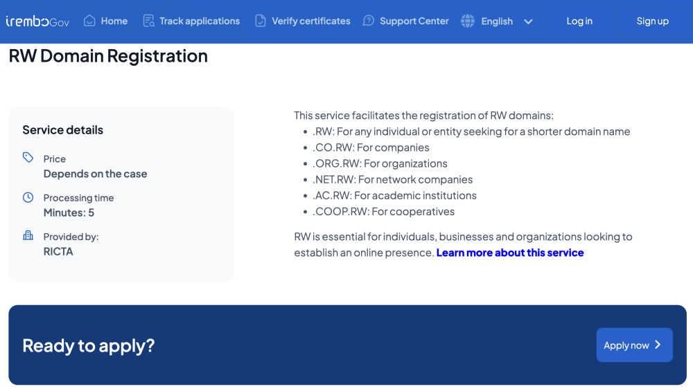 The Rwanda Internet Community and Technology Alliance (RICTA) is proud to announce its RW Domain service can now be found on the upgraded IremboGov platform. This strategic partnership with Irembo, a leading digital services provider in Rwanda, marks a significant milestone in the country’s ongoing digital transformation. By making the RW country domain more accessible, this collaboration aims to simplify the process of domain service, providing a seamless experience for both individuals and businesses seeking to establish a digital presence in Rwanda and beyond. RW domain registration is now available among other services provided on the IremboGov platform. Through this integration, clients can now purchase RW domains directly on the IremboGov platform, aligning with Rwanda’s vision to build a modern digital ecosystem. The addition of RW domain services enhances IremboGov’s comprehensive suite of digital services, empowering Rwandans and international investors with an easy-to-use, centralised platform to access essential online services. Users can now register their RW domains with just a few clicks. This initiative is part of RICTA’s broader effort to promote the adoption of the RW domain, which is essential for establishing trust, and authenticity in the digital space. The RW domain serves as a symbol of Rwanda’s national identity, offering businesses, startups, and individuals a unique opportunity to strengthen their digital presence while supporting the country’s efforts to foster a thriving digital economy. The collaboration with Irembo is expected to increase the visibility and adoption of the RW domain, making it the domain of choice within and beyond Rwanda. RICTA remains steadfast in its commitment to ensuring the growth of Rwanda’s internet ecosystem. The integration with IremboGov is a significant step toward achieving this goal. For more information or inquiries, please email RICTA at infodesk@ricta.org.rw or call 8065 or +250 781 151 371. About RICTA The Rwanda Internet Community and Technology Alliance (RICTA) is a non-profit organisation with a mandate of managing Rwanda’s RW country code top-level domain (ccTLD). For more information, visit https://www.ricta.org.rw/ About Irembo Irembo is a technology company founded in Kigali in 2014 to make Rwanda a digital society. In July 2015, it launched its first product in partnership with the Government of Rwanda, IremboGov. As a Digital Services Partner of the Rwandan Government through IremboGov, Irembo delivers services and innovative digital solutions that enable public agencies to process millions in revenue digitally and help citizens access public services efficiently. Today, we are expanding our product offerings to allow any organisation, public or private, to digitally transform and offer its users better services with meaningful impact. For more information, visit www.new.irembo.gov.rw