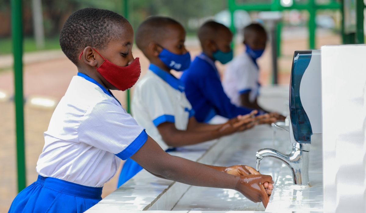 Children wash their hands to prevent the spread of Covid 19 at Groupe Scolaire Kicukiro on January 13, 2021. According to the Ministry of Health, over two million children under 12 will get Covid jab before end of the year.