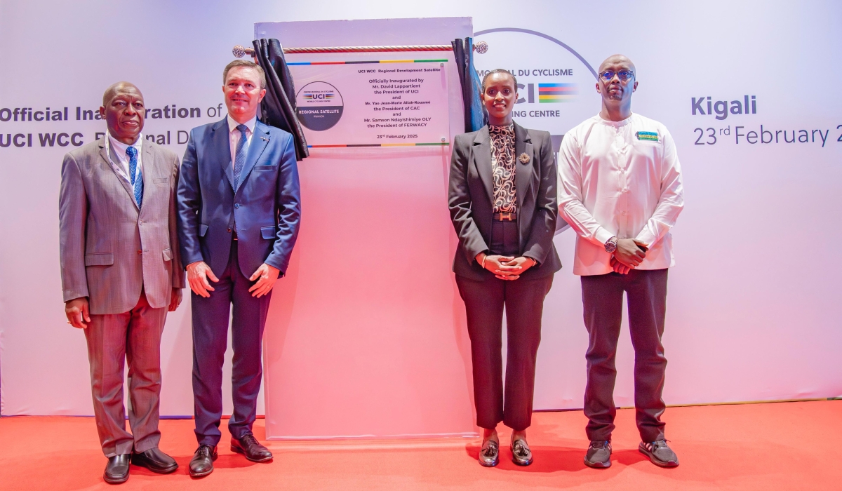 UCI president David Lappartient (second left) and Minister of Sports Nelly Mukazayire (second right) and during the inauguration of UCI-WCC Regional Development Satellite in Kigali on Sunday-courtesy