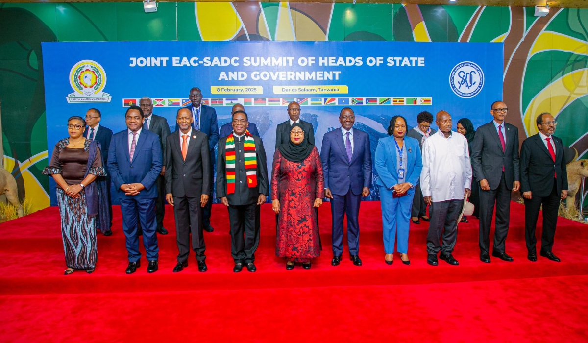 East African Community and Southern African Development Community leaders pose for a photo in Dar es Salaam, Tanzania, during their first joint summit on the security situation in eastern DR Congo, on February 8.