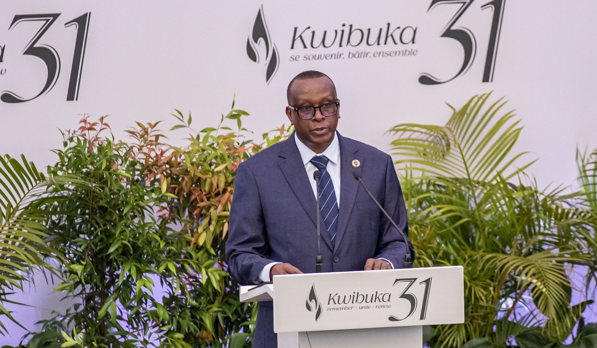 Jean-Damascène Bizimana, the Minister of National Unity and Civic Engagement delivers his remarks at the commemoration event at Kigali Genocide Memorial on Monday, April 7. Photo by Dan Gatsinzi