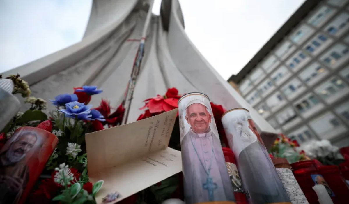 A candle with an image of Pope Francis lies near the statue of the late Pope John Paul II outside the Gemelli Hospital, where Pope Francis received treatment, in Rome, Italy, February 19, 2025 [Guglielmo Mangiapane/Reuters]