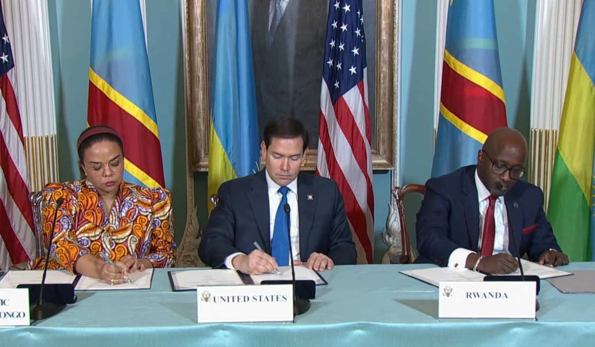 Rwanda's Minister of Foreign Affairs Olivier Nduhungirehe and his DR Congo counterpart Therese Kayikwamba Wagner sign the declaration of principles, witnessed by US Secretary of State Marco Rubio, on Friday, April 25.