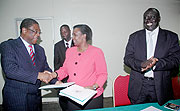 Foreign Affairs Minister Rosemary Museminali (C) and Kenyan Attorney General Amos Wako shake hands after signing as justice Minister Tharcise Karugarama looks on. (Photo J. Mbanda)