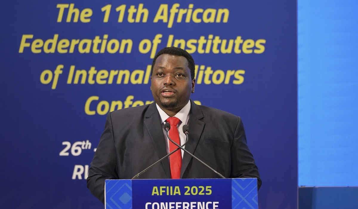 The Minister of State for National Treasury at the Ministry of Finance and Economic Planning, Godfrey Kabera speaking at the African Federation of Institutes of Internal Auditors (AFIIA) summit in Kigali