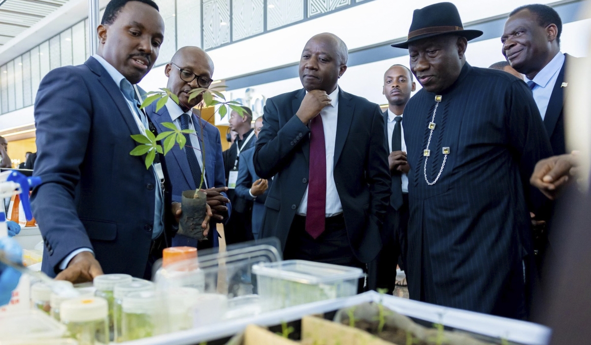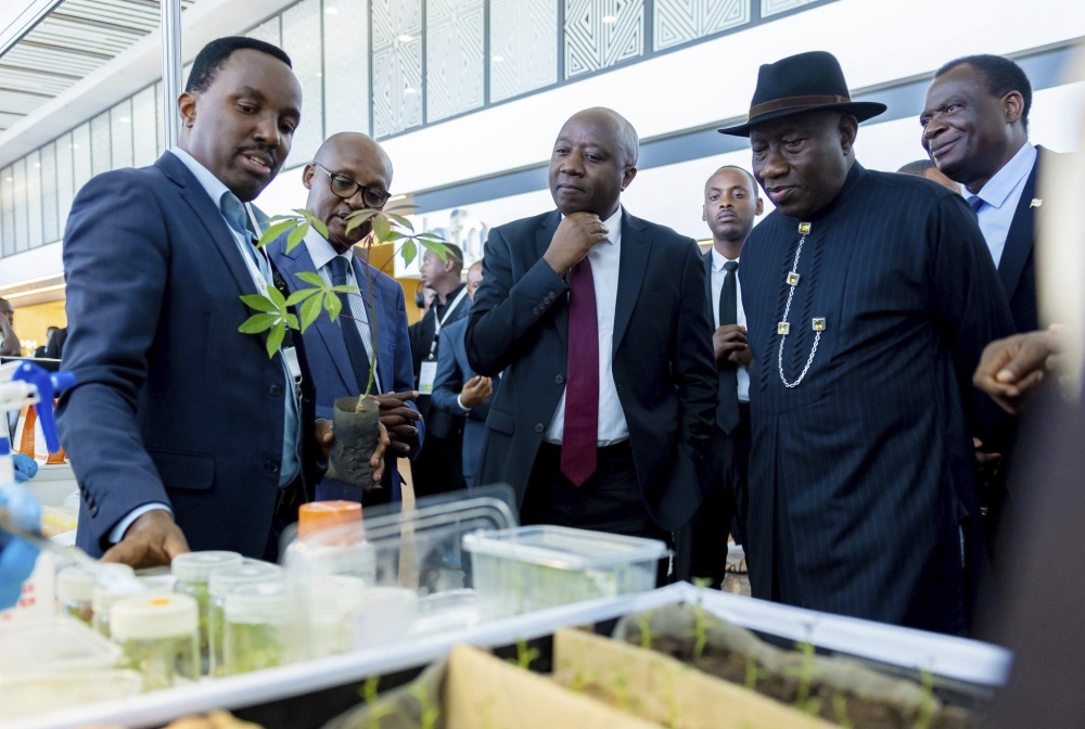 PM Ngirente and former Nigerian President Goodluck Jonathan (R) during a visit of an exhibition at the conference that was held under the theme “NextGen Ag-Tech Solutions for Africa’s Farmers.” Courtesy