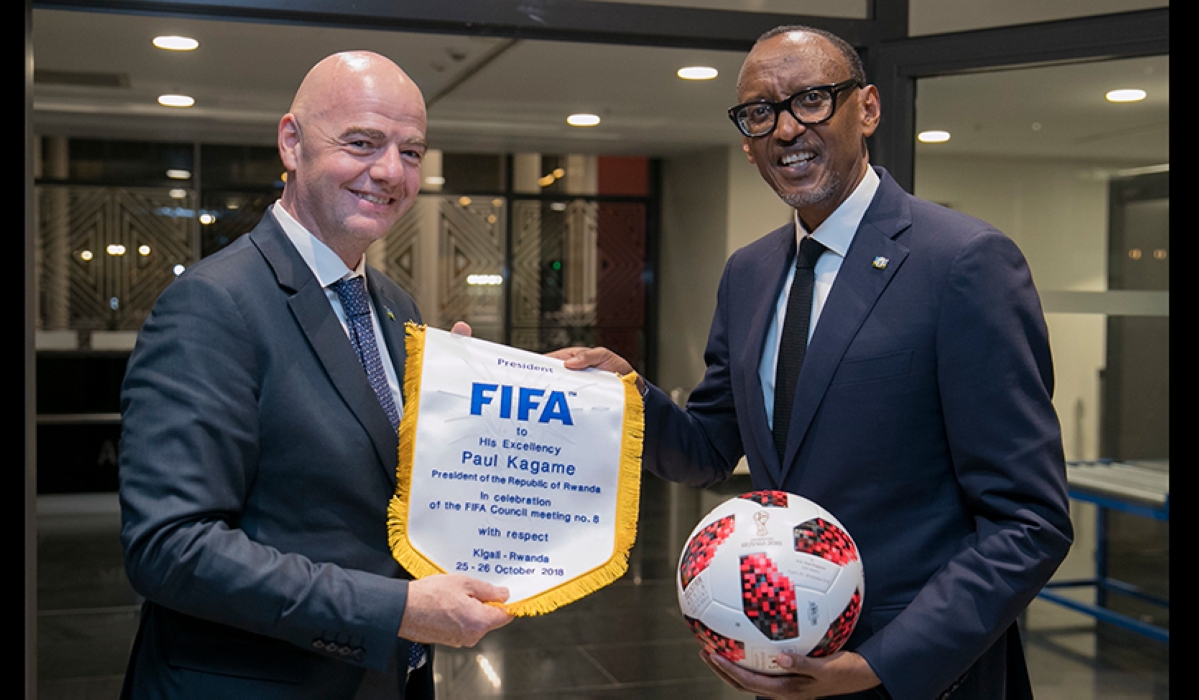 President Paul Kagame and Gianni Infantino at a gala dinner with FIFA Council Members in Kigali on October 25, 2018. Infantino is set to be elected for a third-term during the 73rd FIFA Congress due to be held in the Rwandan capital early next year. Photo/Village Urugwiro
