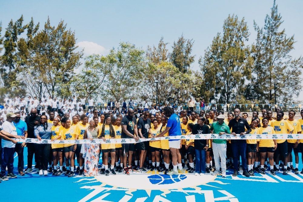 Los Angeles Clippers star Kawhi Leonard cuts the ribbon during the official unveiling of three basketball courts built by Giants of Africa at St Igatius School in Kibagabaga, Kigali-courtesy photos