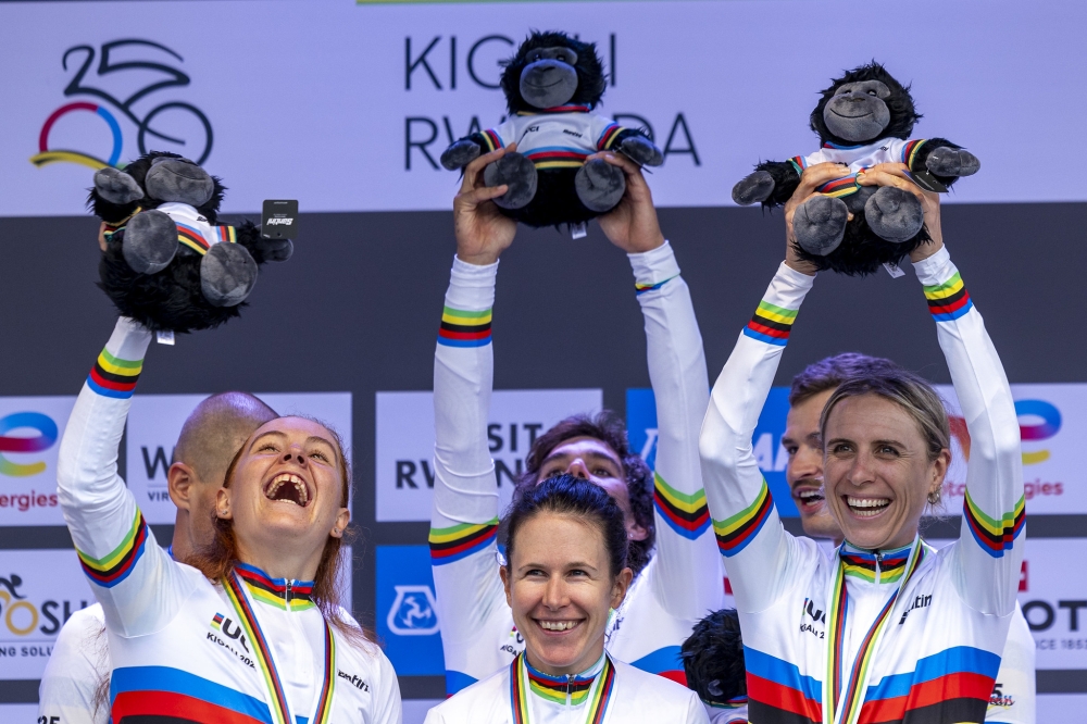 Team Australia celebrate the victory after claiming Gold medal at the UCI Road World Championships in Kigali on Wednesday, September 24. The victory highlighted Australia’s consistency after edging Germany last year in Zurich. Photos by Olivier Mugwiza and Dan Gatsinzi