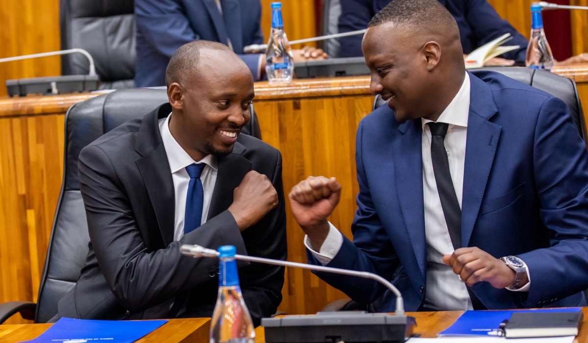The newly appointed cabinet ministers, Dr Sabin Nsanzimana, the Minister of Health and Dr Yvan Butera, Minister of State in the Ministry of Health cheer each other during the Swearing in ceremony on Wednesday, November 30. All Photos by Olivier Mugwiza