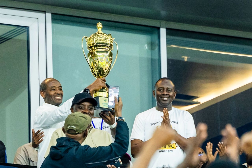 Rwanda Defence Force Chief of Defence Staff Gen Mubarakh Muganga lifts the trophy after APR FC’s emphatic 4–1 victory over Rayon Sports in the 2025 FERWAFA Super Cup, played on Saturday at Amahoro Stadium on January 10. All photos by Olivier Mugwiza.