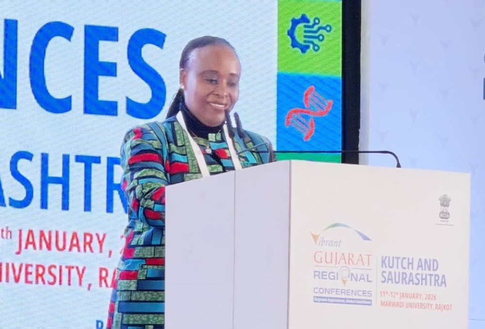 Rwanda's High Commissioner of India, Jacqueline Mukangira, delivers her remarks at the Vibrant Gujarat Regional Conference, 11-12 January, 2026, in the city of Rajkot. Courtesy
