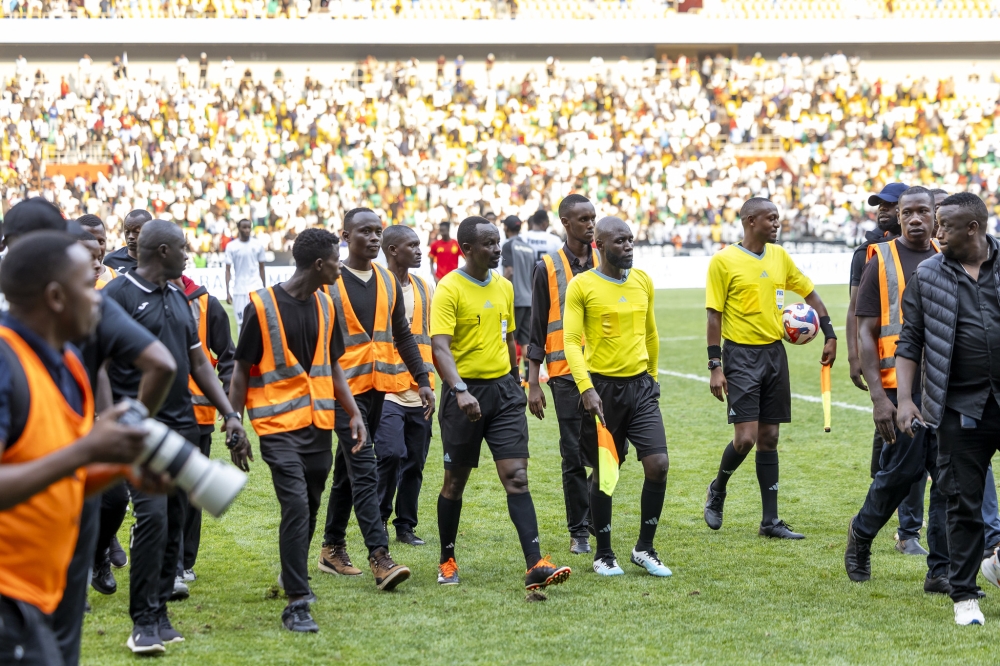 Match officials escorted by security agents following the tension at Amahoro Stadium. Tensions flared after APR FC were controversially denied a late winning goal when Dauda Yussif’s powerful long-range strike was ruled out for offside by the match officials. All photos by Olivier Mugwiza