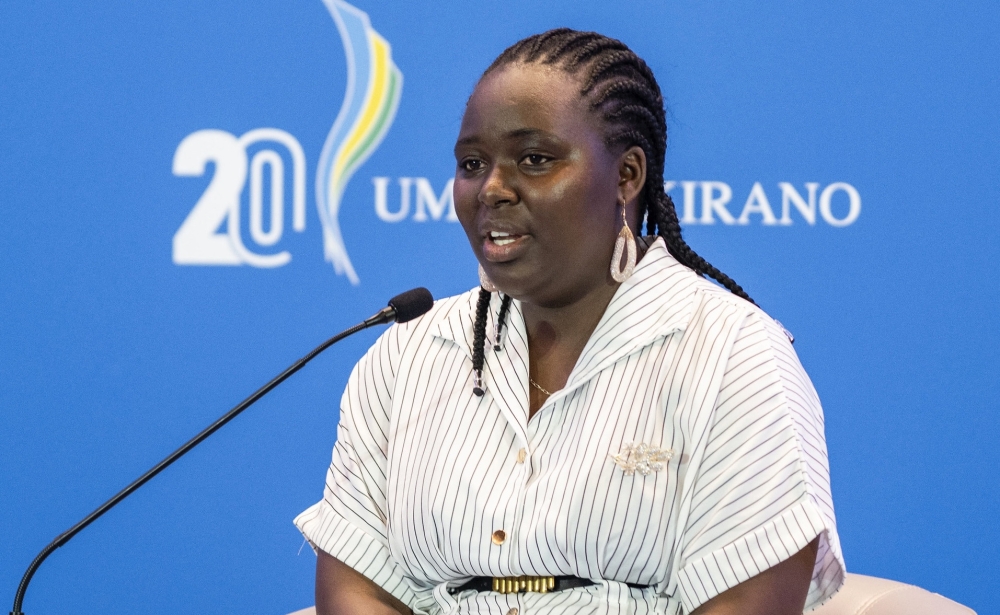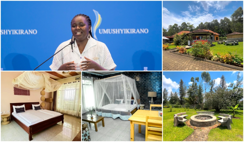 A collage of Karisimbi Cave Resort owner Aline Ishimwe speaks during a panel discussion at Umushyikirano on Friday, February 6, and some facilities of her resort in Musanze District.