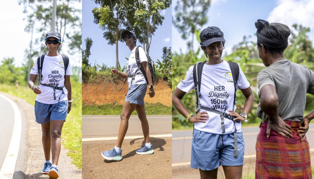 Actress Rosine Bazongere during her walk of 160 kilometres from Kigali to Nyagatare, for raising awareness and mobilising support for girls who cannot afford essential menstrual hygiene products. Photo