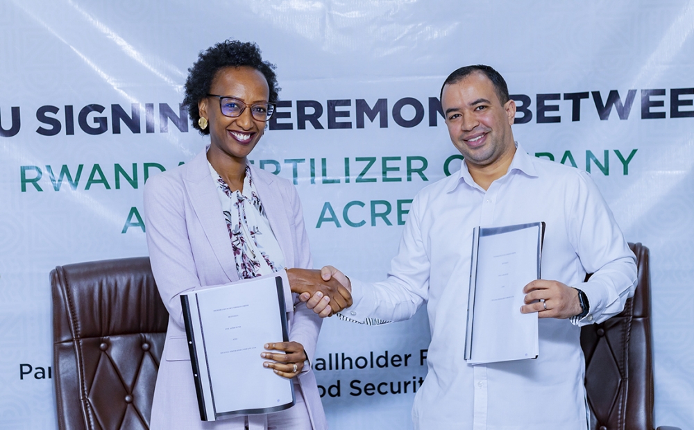 Anass Khanchoufi, the Managing Director of Rwanda Fertilizer Company and Belinda Bwiza, One Acre Fund Country Director sign an agreement in Bugesera on February 23. Courtesy