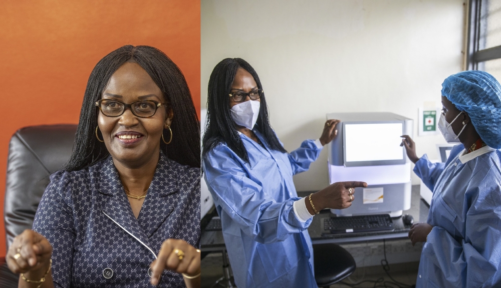 during the interview (L), Dr Mukagatare interacts with a Lab technician at RBC. Photos: Emmanuel Dushimimana