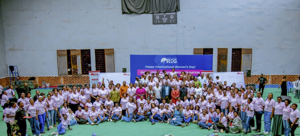 Participants and officials pose for a group photo at the celebration of the International Women's Day. The event brought together REG management, staff, women, and girls.Photos by Kellya Keza