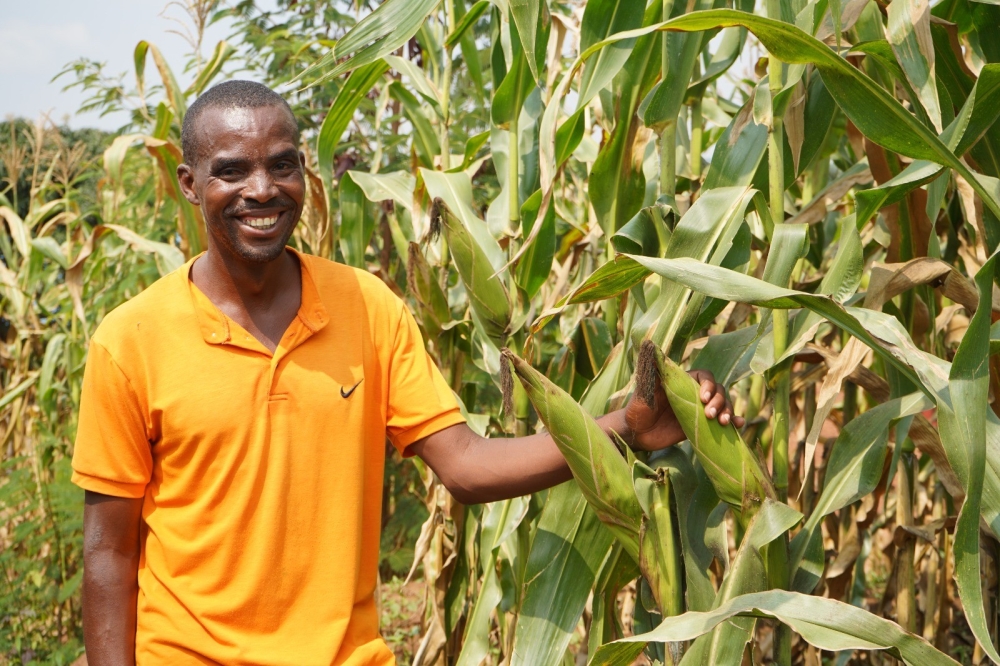 A farmer stands in his maize plantation grown on radical terraces developed under CDAT, a $300 million project funded by the World Bank and implemented by the Rwanda Agriculture and Animal Resources Development Board. Courtesy