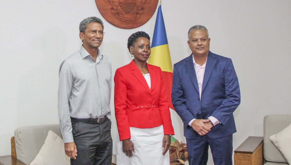 The Minister of Public Service and Labour, Christine Nkulikiyinka meets Seychelles Vice-President Sébastien Pillay, to discuss Louise Mushikiwabo’s bid for another term , on Saturday, March 21. Courtesy