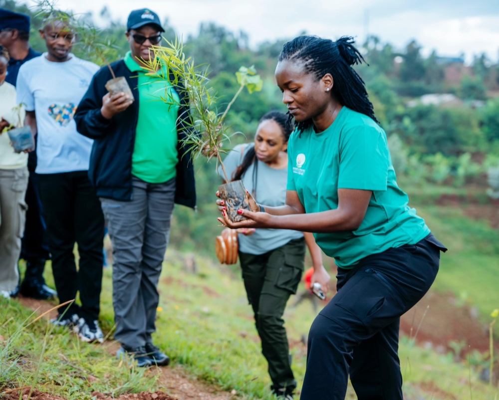 The Minister of Environment, Bernadette Arakwiye, during a tree planting exercise at the joint celebration of the International Day of Forests, World Water Day and World Meteorological Day on Saturday, March 28.