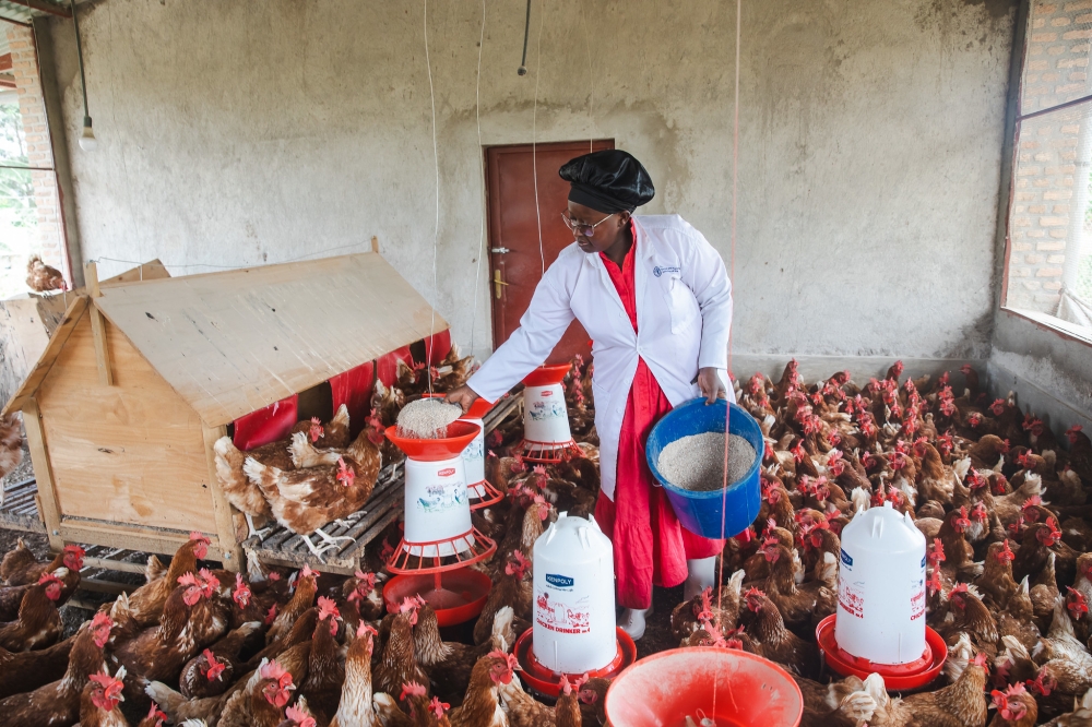A poultry farmer Nyirabagwiza feeds her chickens. The Minister told Senators that the government will address rising animal feed prices by expanding distribution outlets, increasing storage capacity, boosting maize and soybean production and strengthening feed quality regulation. File