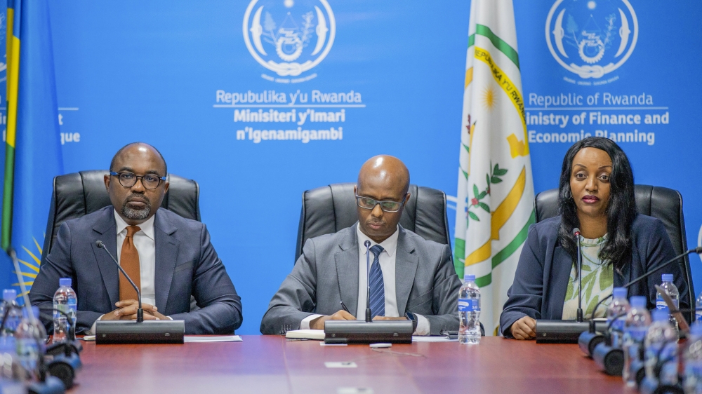(L-R) IMF team representative Albert Touna Mama, Finance Minister Yusuf Murangwa and Central Bank Governor Soraya Hakuziyaremye during a press conference on Thursday, April 2. Photos by Kellya Keza
