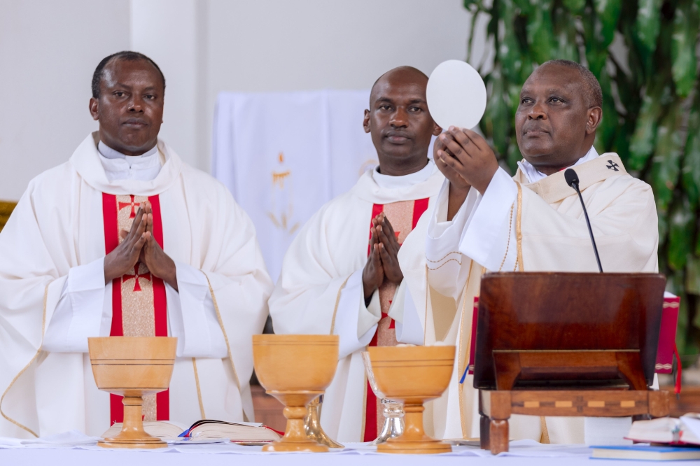 Archbishop of Kigali, Cardinal Antoine Kambanda, leads Holy Communion alongside fellow clerics during the Easter celebration at St Michel Cathedral on Sunday, April 5. All photos by Kellya Keza.