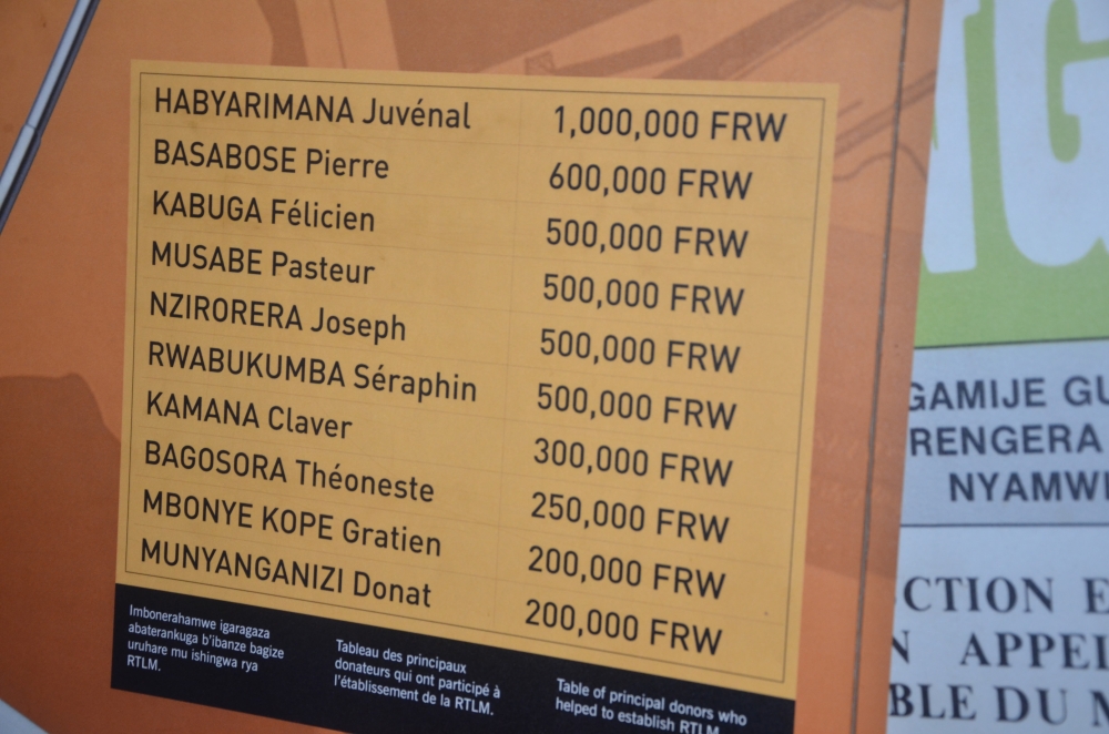 A photograph of a list of leading contributors to RTLM, preserved in the archives at the Kigali Genocide Memorial. In 1994, the big powers that had the means to jam or disrupt broadcasts of the hate radio, RTLM, that fanned hate, spread genocide ideology and directed the killers, refused to do so on the grounds that it would be a violation of Rwanda’s sovereignty. Photo by Sam Ngendahimana