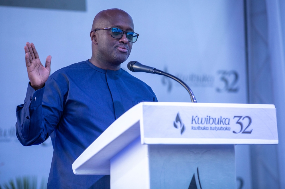 Minister of Foreign Affairs and International Cooperation, Olivier Nduhungirehe addresses mourners during the 32nd anniversary of the Genocide against the Tutsi at Kicukiro-Nyanza Genocide Memorial on Saturday, April 11. Photos by Craish BAHIZI