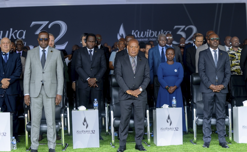 (L-R) Minister for National Unity and Civic Engagement Jean-Damascène Bizimana, Senate President Francois Xavier Kalinda, and Philibert Gakwenzire, President of IBUKA and other mourners observe a moment of silence in honour of the victims at Rebero Genocide Memorial on Monday, April 13. Photos by Craish BAHIZI.