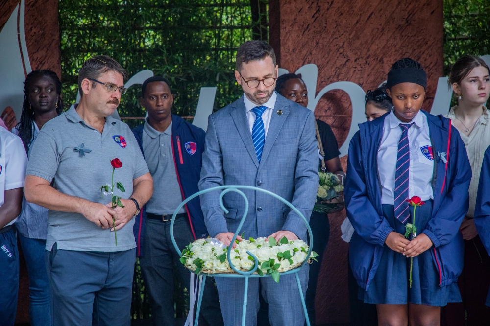 Ntare Louisenlund School official and students observe a moment of silence in honour of the victims of the Genocide gainst the Tutsi at Kigali Genocide Memorial on Saturday, April 25. Photo by Craish