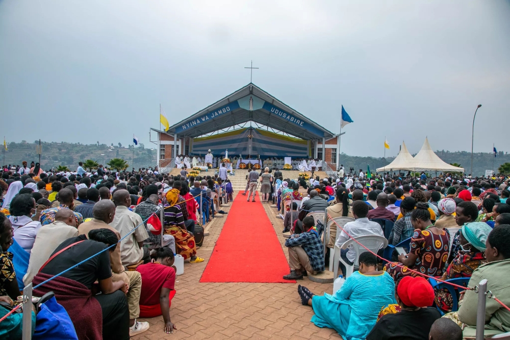 The cold Monday morning, August 15, would not stop the Roman Catholic congregation heading to Kibeho, a small town in Nyaruguru District famous for apparitions of the Blessed Virgin Mary that first happened in 1981. Kibeho is a four-hour drive from Kigali, and its major visitations are on Assumption Day, and November 28, the anniversary of the Virgin Mary’s appearance. For years, Catholics from all over the world have travelled to this holy land to celebrate the life of Mary, the mother of Jesus, and to contemplate her outstanding example of fulfilling God’s will in her life. That is why early birds start reaching Kibeho days before Assumption, while others walk from Kigali to Kibeho, a process that takes them at least three days. Others start their journey on D-day, but early in the morning so they can make it on time for the 11:00 am mass. I reached Regina Pacis in Remera where the team I was going with was at 5:30 in the morning, almost everyone was there. One of the three buses I found there took off in less than 10 minutes. Ours was the last to depart, because they had a ‘leave no one behind’ policy no matter what. We departed at 6:00am, then passed at St. Michael Cathedral to pick up other people, so we really hit the road 30 minutes later, and passengers were already complaining about being late for the mass. The group I was traveling with, ‘Indabo za Mariya’ (Mary’s flowers), goes to Kibeho every month. Before I started to recuperate my night sleep on the long drive, they started praying the rosary, singing, excitedly, all of them- except me. They prayed until we reached Kibeho, and the excitement grew as soon as we started seeing the cross on the church. Cars and buses were lined up on both sides of the road, I believe they were hundreds; and people were walking in a rush to take the front rows, which I understand were already taken by 7:00 am. You see, when I got there, hardly 10 minutes past 11:00, I couldn’t see the front. In fact, I was lucky the lady we came together on the bus, Christine Uwamahoro, had carried all the necessary things, especially her Kitenge that she spread on the dry grass in the compound for us to sit, and the umbrella we would use if the sun or rain were too much. One of the things I wish I knew before going on this pilgrimage was that a chair, jerry can and umbrella are very important. Everyone in my sight was either standing or sitting on the ground, and to be honest, if the speaker did not introduce themselves, no one would know who they were. Uwamahoro, who was on her third pilgrimage, told me that if one doesn’t pay close attention, the mass would start and end without them knowing. What stood out most was the music and how everyone, thousands of people, would stretch their arms in and out to dance to songs such as: As the deer pants for water, Sinogenda ntashimye, and more. Sylvia Kayesu, 30, travelled from Uganda and reached Kibeho on Sunday morning. She and the team she came with had prayer sessions preparing for this day. “I love the experience, the power of the Holy Spirit, and the people around. I can’t wait to come back or at least with someone else,” Kayesu said. She shares the experience with Mathilde who has only been in the country for a month from France. “I am Catholic, so this is an opportunity to attend this kind of pilgrimage. It is my first time,” she said. The holy water and clay While some were attending the mass, hundreds others lined up around the ‘holy water,’ believed to cure all diseases! At the spot, several traders were lined up with their merchandise that include neck and arm rosaries in different beautiful colours, the most expensive being Rwf1500. They also sell jerry cans of 3 and 5 litres at Rwf1,000 and Rwf1,500 for those who didn’t carry their own. But the majority of the people had their own, even the ones on the bus had carried them. The ‘holy water’ is free of charge. But some people who live in the area fetch it and sell it to whoever doesn’t want to line up. 25-year-old Emerance Dusabimana was carrying her 9 months baby on her back, and a 10-litre jerry can. In less than 10 minutes, not a drop was left. Though she is not Catholic, she can’t resist the excitement in the area when there is a pilgrimage. Dusabimana usually depends on tilling other people’s land, but on Assumption Day, she makes enough money selling ‘holy water.’ For example on this day, by 12:00pm, she had already made Rwf3,000 from selling this water. Apart from the business part, Dusabimana testifies to the power of the blessed water, given how people in the area use it for different things. “Before I got married, I used to be possessed by demons, until I put this water in a sachet and hung it in my room. I am now doing well,” Dusabimana revealed. The holy water is found in a valley, so you can imagine how steep it is, given how mountainous Rwanda is. Some even sell clay from the wetland, believed to also be holy because it is got from where the holy water flows. Apparently, people smear it on their bodies for healing too. A handful buys Rwf100. Mary saw us out While on the bus waiting for others to return to Kigali, some people entered saying that Mary had appeared to them. First, they said, it was in the drizzles during the Holy Communion. Then they said it was through the sun apparently. The excitement in their eyes made me regret leaving the site the moment the Bishop said we may go in peace. But I was also sceptical, because the things they were explaining were more like childhood stories some children were making up. But when the bus was just departing, I saw it too, and I couldn’t believe my eyes. At that moment the sun could be too much in one minute that you can’t look at it, but it would then change in a second to something that looked like a full moon, but white, and not shining at all. A lady that was seated just before me told us that it is Mary seeing us out. We then returned 