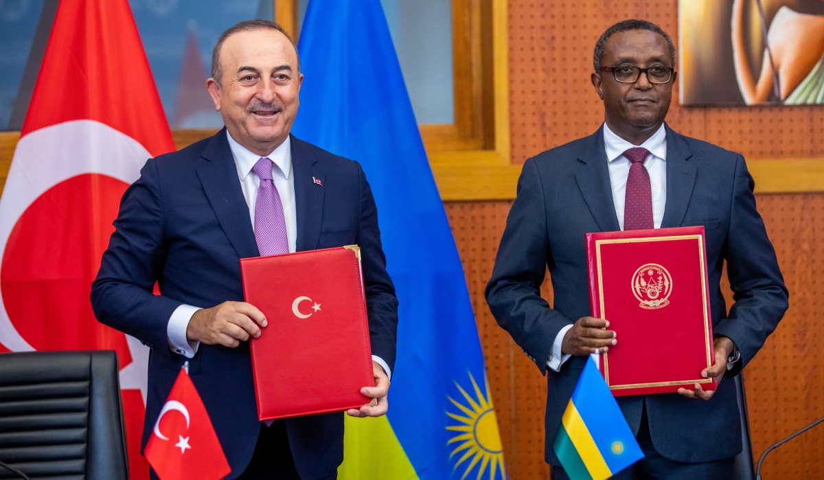 Rwanda and Turkey on Thursday, January 12 signed three cooperation agreements to further enhance the 'good’ bilateral ties between both countries. The agreements were signed by Vincent Biruta, Rwanda’s Minister of Foreign Affairs and his Turkish counterpart, Mevlüt Çavuşoğlu who is in Rwanda on a working visit. ALSO READ: Turkey and Rwanda enjoy good bilateral relations Prior to the signing ceremony, the Turkish minister visited the Kigali Genocide Memorial site and paid tribute to victims of the 1994 Genocide against Tutsi. He also held a tête-à-tête with Minister Biruta flanked by delegations from both sides. The agreements include general cooperation, culture, as well as science, technology and innovation. Biruta said the partnerships between both countries are vibrant and they are exploring ways of signing more. “We also discussed increasing trade and investment between our countries...and very soon, we will sign a host country agreement for the Turkish Maarif Foundation which will invest in TVET training in Rwanda,” he added. Çavuşoğlu noted that the annual business forum between both countries organised by the private sector is a major driver of increased trade volumes and Turkish companies are very much interested in infrastructure projects in Rwanda. Turkish firms have been part of the construction of different projects such as the Kigali Convention Centre, BK Arena, and the ongoing renovation of Amahoro Stadium. “The current level we have reached in trade is not satisfactory. Yes, five times increase in three years but the potential is huge and we should set new targets by $1 billion trade for the future,” he said. According to available data, Rwanda's exports to Turkey have increased from $31million in 2019 to $178 million in 2022. On the other hand, Rwanda has attracted Turkish investors in the recent past with the Turkish tycoon, Ferit Şahenk promising that his multinational’s operations in Rwanda will “do something very good for the country.” This can be traced by a step taken by his company, Doğuş Group, to invest in Rwanda’s hospitality sector by setting up at least three luxury resort hotels as announced in September last year. The hotels are expected to be constructed in Kigali, Karongi, and around Lake Kivu belt. Doğuş Group is one of the largest private conglomerates in Turkey. It has a portfolio of 250 companies in seven industries, including high-end car dealerships, retail stores, restaurants, cafes, construction companies, radio stations, and media and tourism businesses. Africa benefits from Black Sea Grain Initiative The Turkish Minister also said that Africa is set to benefit from the Black Sea Grain Initiative, an agreement between Russia and Ukraine made with Turkey and the United Nations during the 2022 Russian-Ukraine crisis to safely transport grain and foodstuffs from Ukrainian ports. “We intend to expand the volume of grain products in Africa by processing them in Turkey. We also want to expedite the export of fertilizers which is also important for the agricultural growth and productivity of Africa,” he noted.